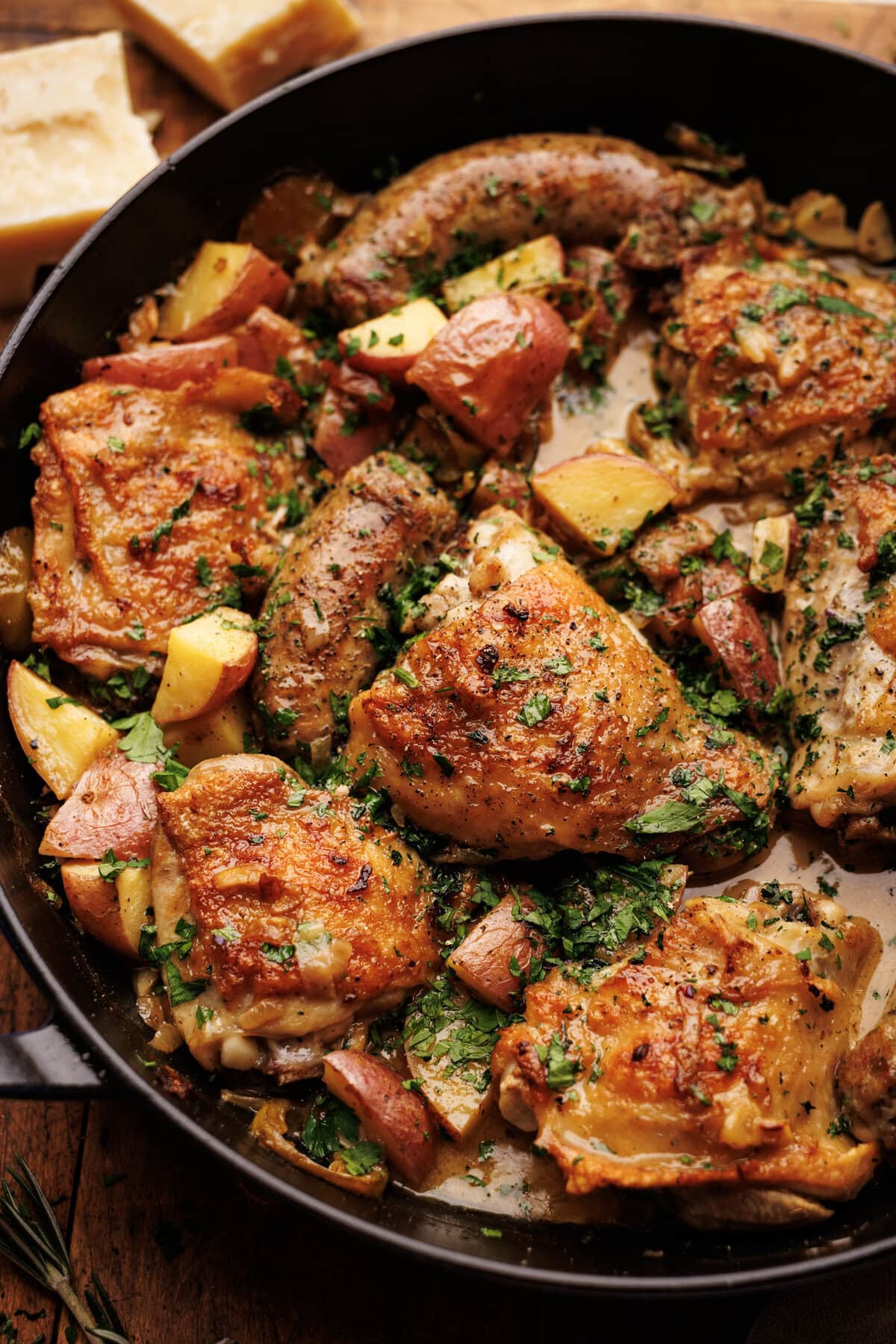 What I love most about chicken scar is that it’s a one-pan meal. You have plenty of protein from chicken and sausage, along with some starch from perfectly cooked potatoes, which are flavored with a delicious sauce.