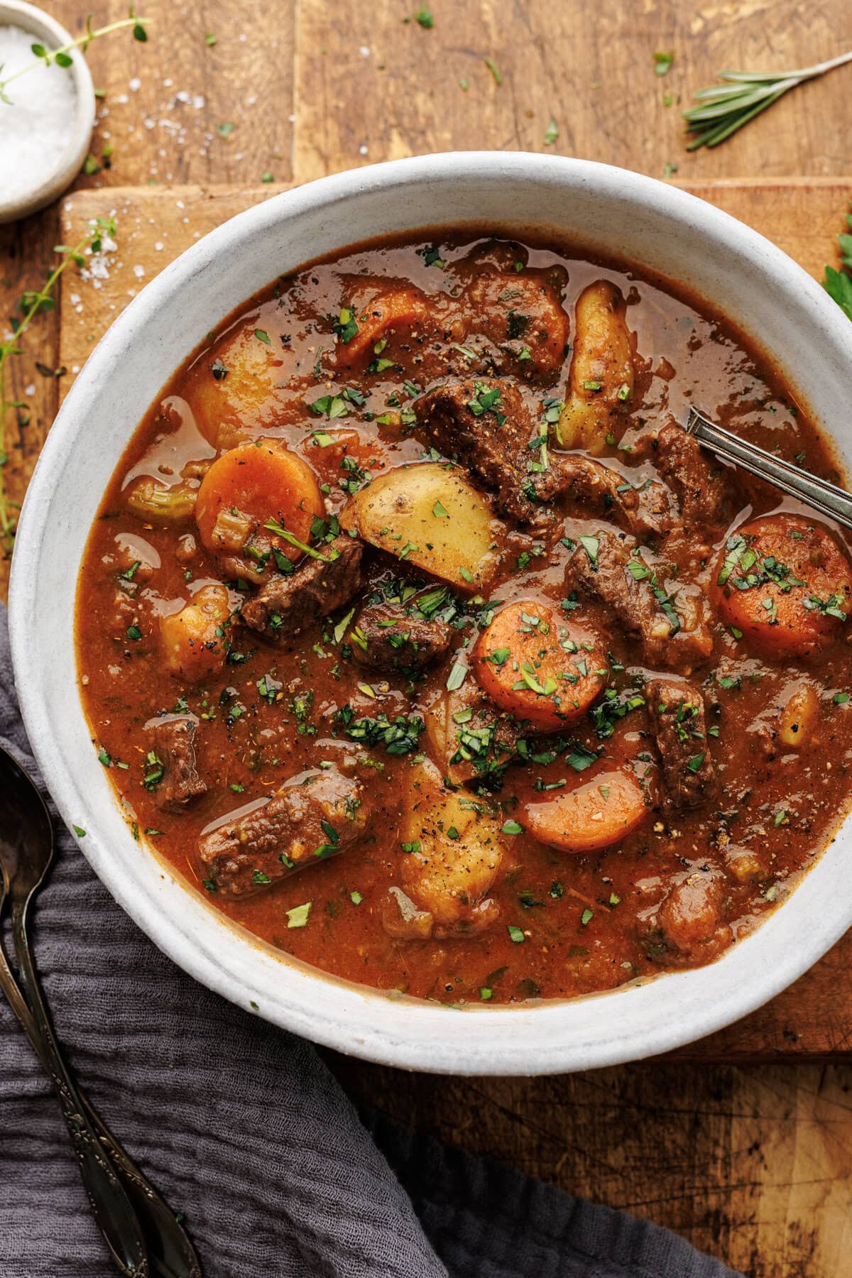 While testing this recipe, I found that many traditional beef stews had three things in common. They didn’t have enough fresh herbs, the recipe called for red wine, adding complexity for many home cooks, and the consistency was too thick – almost gravy-like.